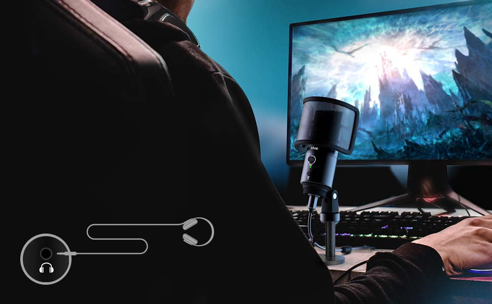 - EASY-TO-REACH CONTROLS - The gain knob enables quickly adjustment if there is any sensitivity, lack of sound or distortion during live broadcasting. Or if you want to take a break in the middle of a podcast, use the instant mute button. And there is a 3.5mm headphone jack on the back of this USB streaming mic for real-time monitoring.