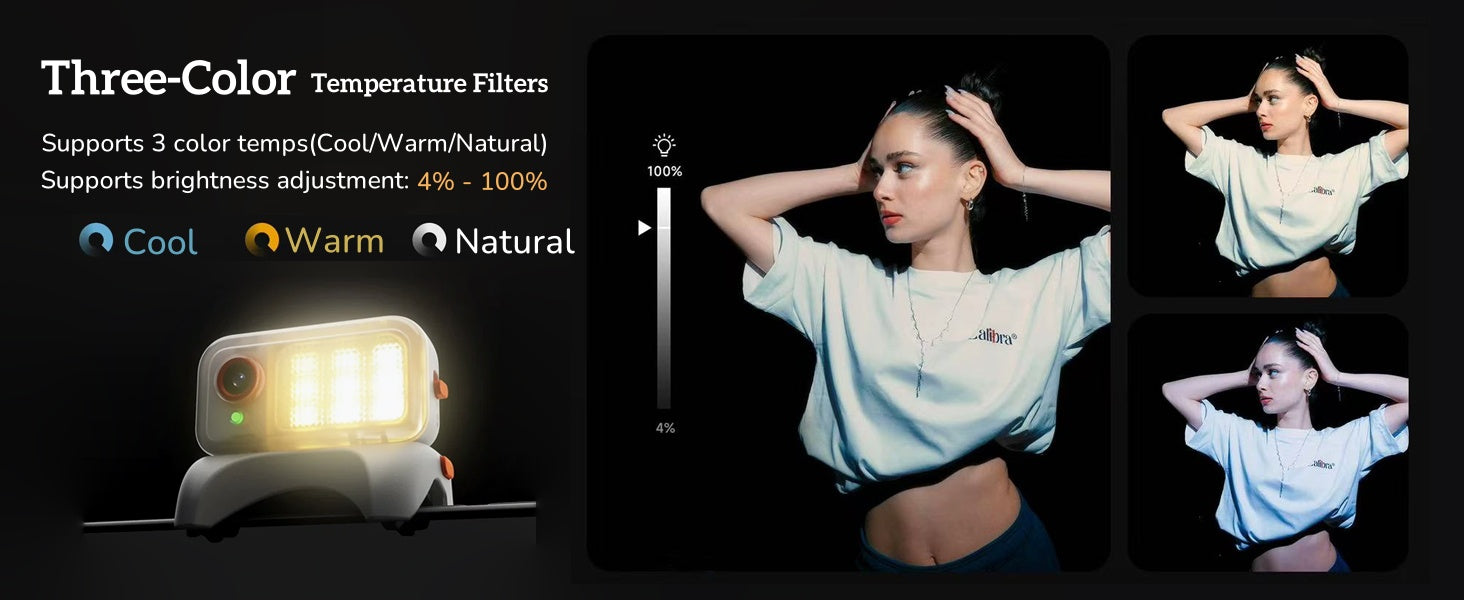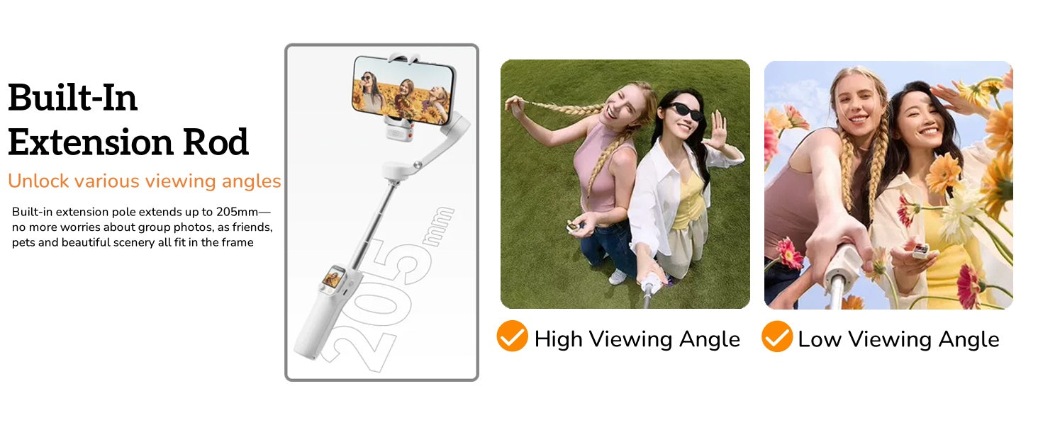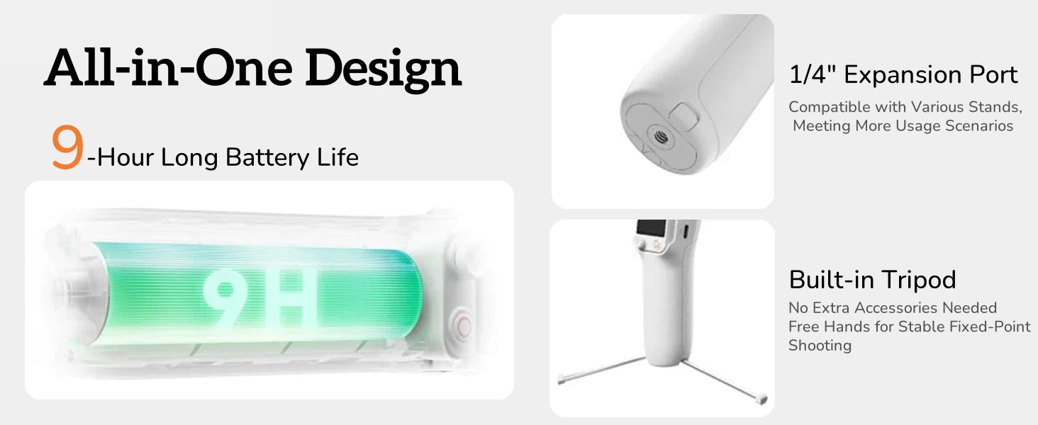 - Built-in Telescopic Extension Rod & Dual-Color Temperature Fill Light: Innovative integrated retractable extension rod unlocks low-angle and selfie perspectives with a single click. The rod features a dual-color temperature light with three brightness levels, providing natural beauty lighting for your face in low-light environments like nighttime or dimly lit interiors.