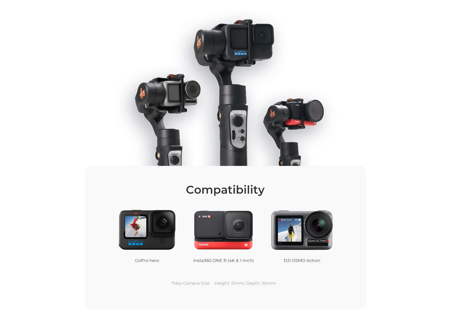 Compatible Cameras | GoPro Hero 5-13, DJI OSMO Action, Insta360 ONE R (4K & 1-Inch), SONY RX0 and other action cameras with similar size and weight. |