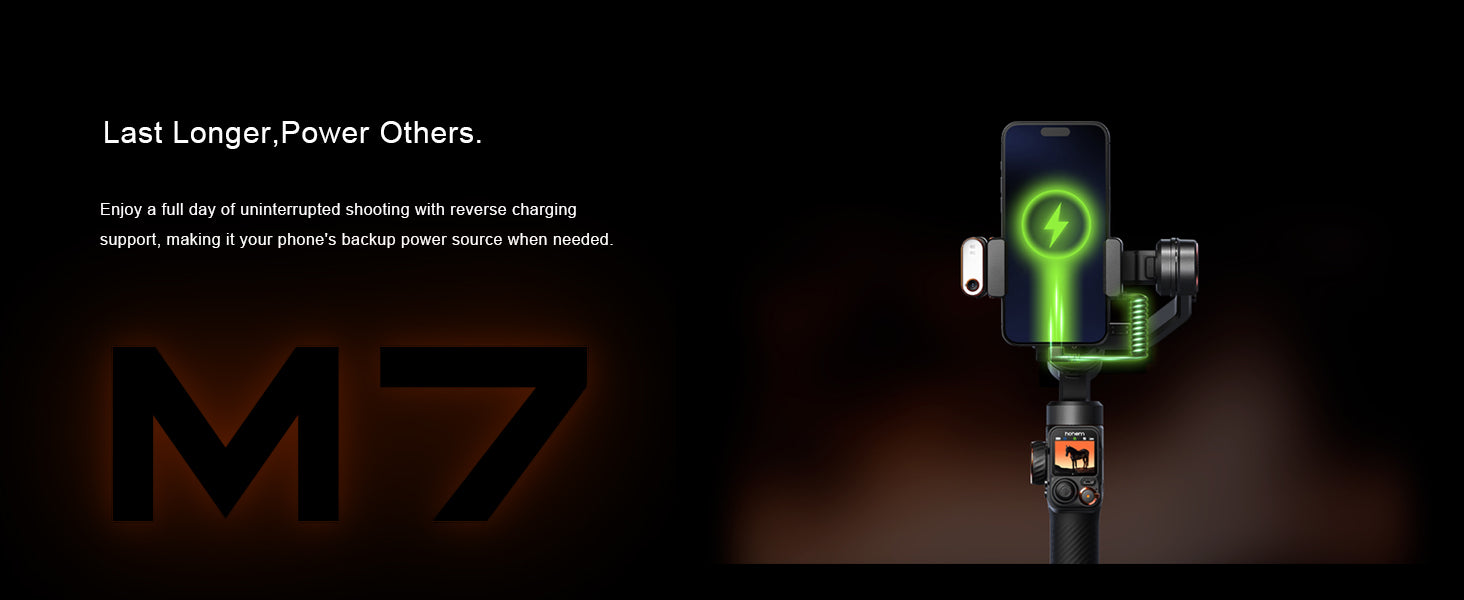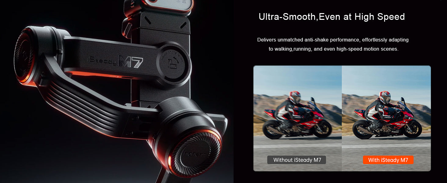 - iSteady M7 Featuring a professional orthogonal 3-axis design, it provides 360° infinite pan rotation and a 325° wide tilt range, granting you complete freedom in camera movements