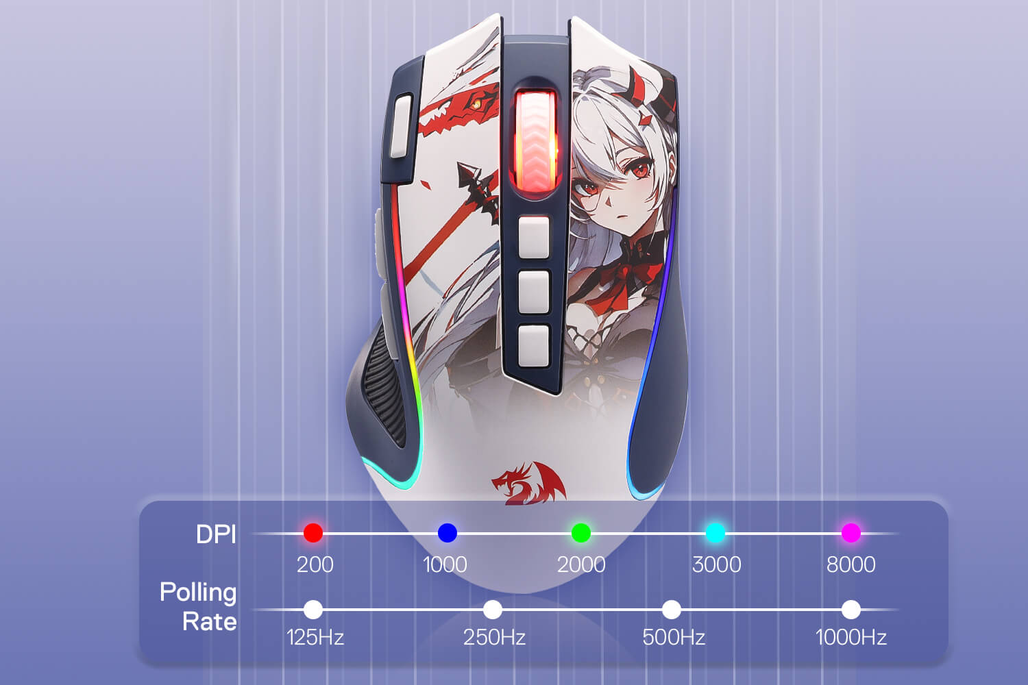 - Pentakill, 5 DPI Levels - Geared with 5 redefinable DPI levels (default as: 500/1000/2000/3000/8000), easy to switch between different game needs. Dedicated demand of DPI options between 500-8000 is also available to be processed by software.