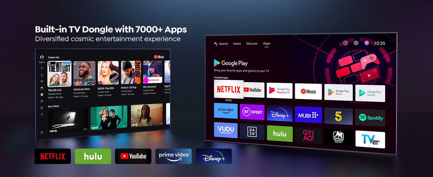 Android Support Android TV with access to 7000+ apps, including Netflix, Prime Video, YouTube, Disney+, and more