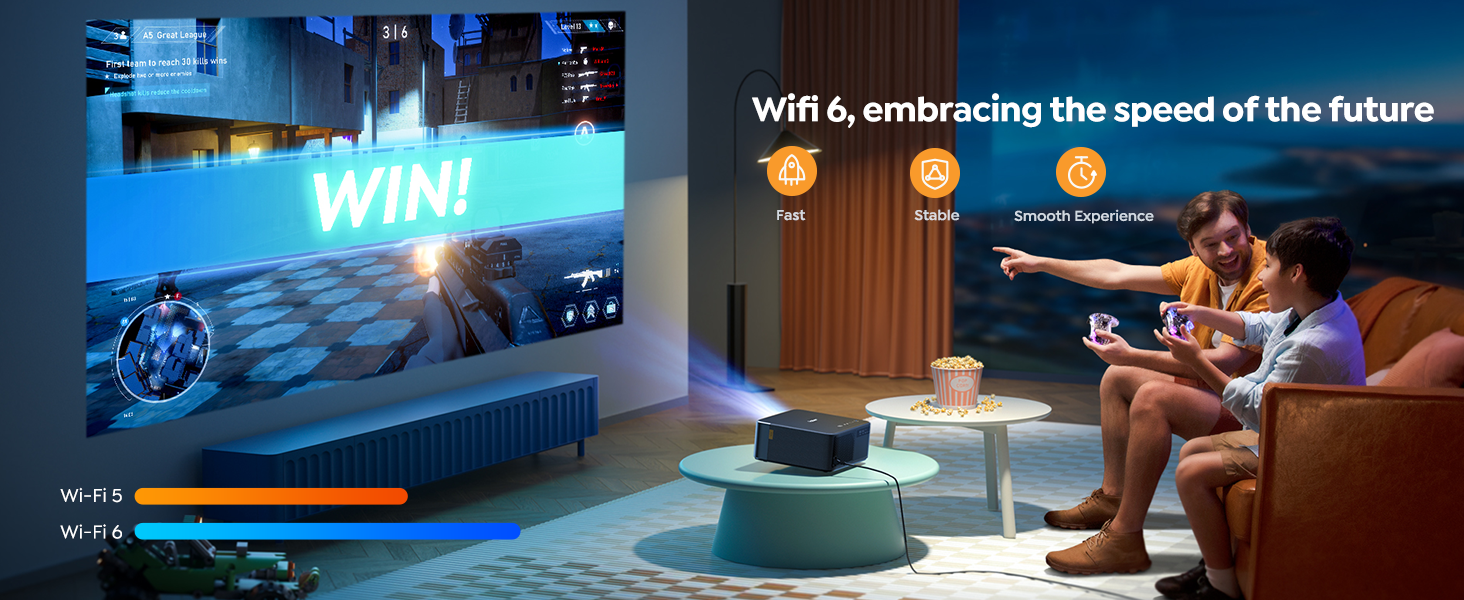 WiFi6 Bluetooth projector, Get rid of lag and watch movies smoothly.