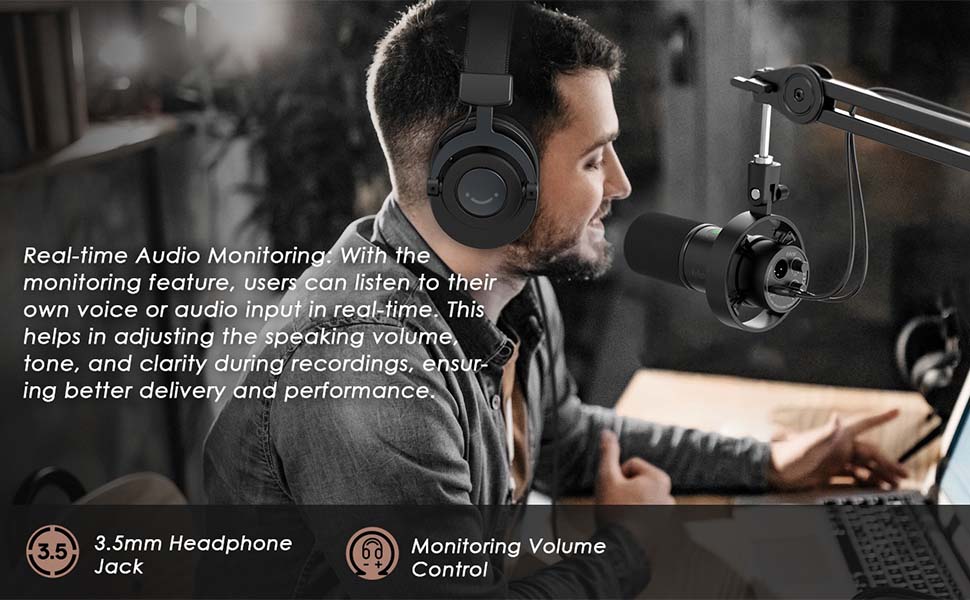 - [Monitoring and Volume Adjustment] The podcast mic ability to 3.5mm jack real-time monitoring along with headphone volume control are added bonuses to recording professionals standing out studio podcasting. Monitor if your output voice as intended or noise reduction effect, and directly set the monitoring volume on the streaming mic to listen to each frequency audio. The PC microphone for recording is more accessible for voice-over work. (Only available for USB connection)