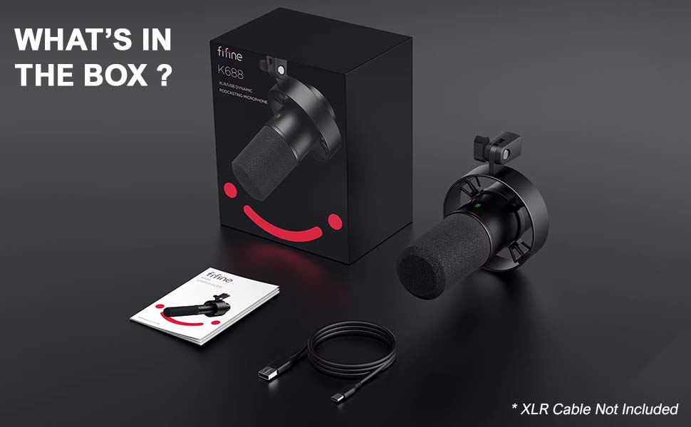 - Warm Tips: 1. The recording studio product comes with a dynamic microphone with shock mount, an 8.2ft (2.5m) USB C to USB cable, a 5/8'' to 3/8'' adapter, a user's Manual (XLR cable, boom arm, mic stand not included). 2. When using XLR connection, it is suggested to use XLR to XLR cable for more stable audio. 3. All function keys are only available for USB connection.