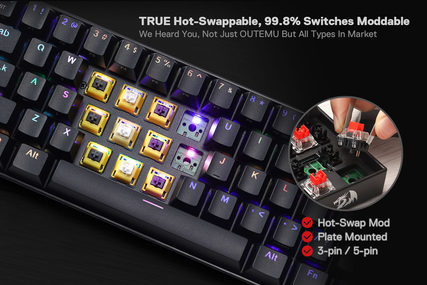 - YES! TRUE HOT-SWAP - The transformative innovation with 99.8%+ switches compatible free-mod hot swappable Redragon keyboard is available now. The unique exclusive structure design of the socket makes the switch mounting easier and less wobbling.