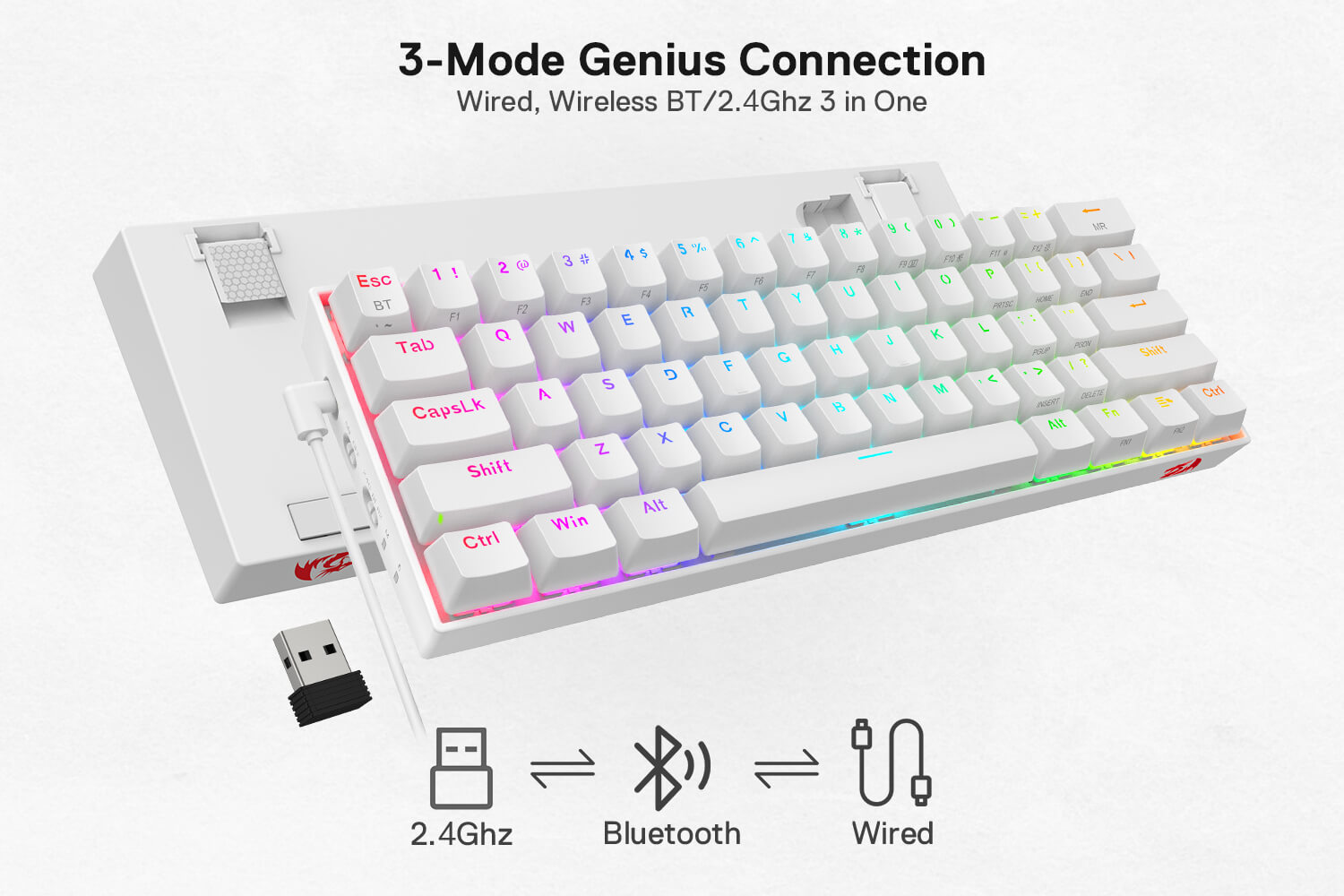 - 3-Mode Connection - Geared with Redragon innovative tri-mode connection technology, USB-C wired, BT 3.0/5.0 & 2.4Ghz wireless modes which make the user experience upgraded to another level in all fields.