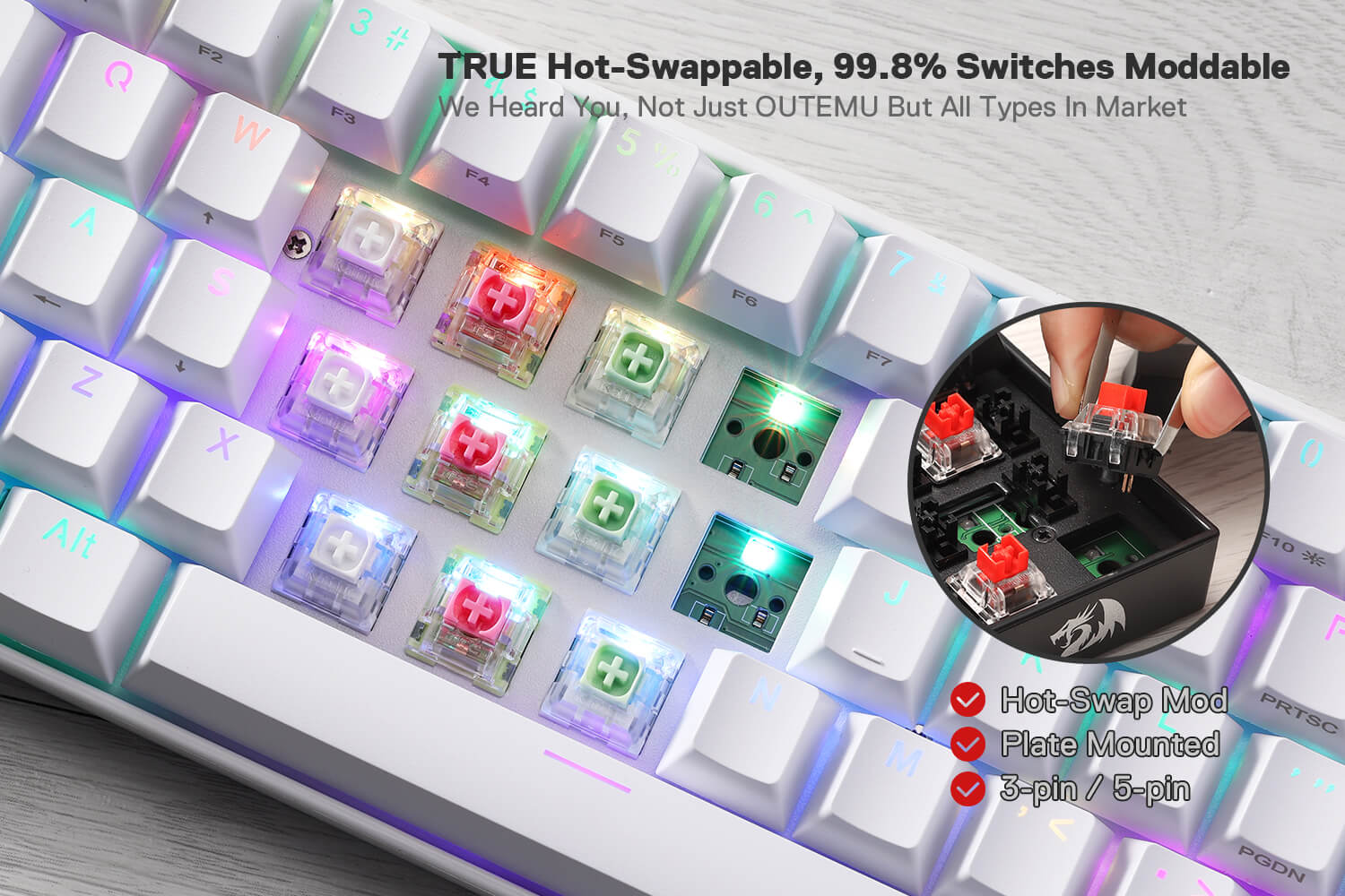 - YES! TRUE HOT-SWAP - The transformative innovation with 99.8%+ switches compatible free-mod hot swappable Redragon keyboard is available now. The unique exclusive structure design of the socket makes the switch mounting easier and less wobbling.